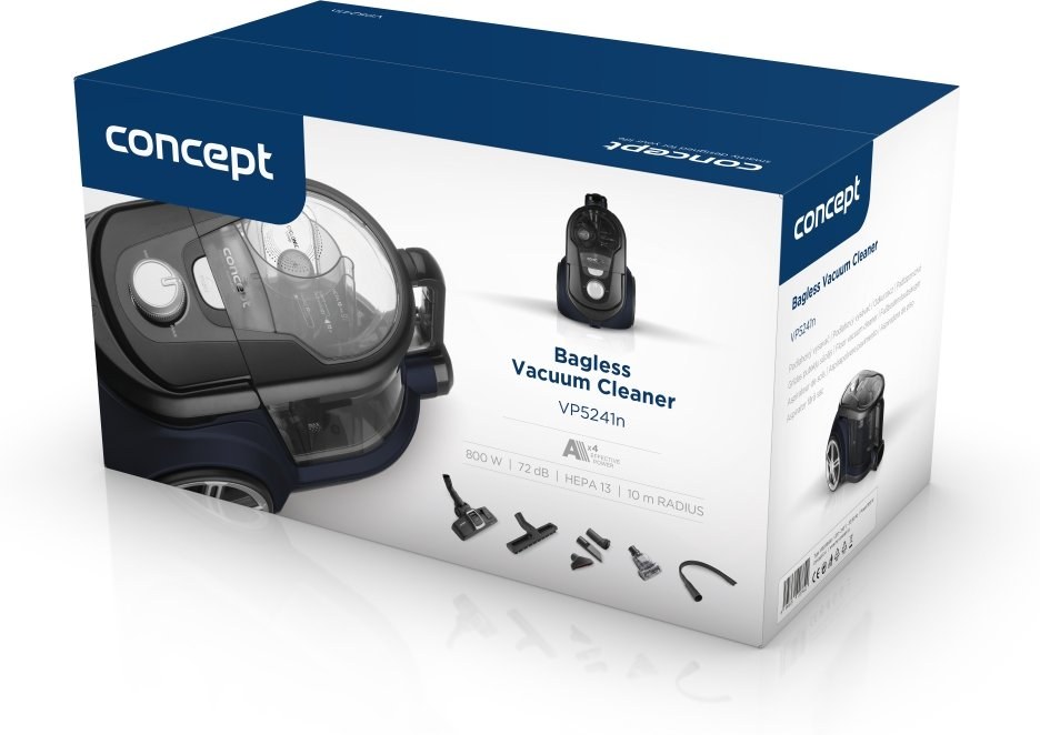 Bezvreckový vysávač je osadený vysoko účinným ECO motorom s príkonom 800 W, ktorý má dostatočný výkon pre perfektné upratanie celej domácnosti. Saciu silu môžete jednoducho upraviť vďaka elektronickej regulácii. Systém cyklónu spočíva v odstredivej sile pôsobiacej pri rotácii vysávaného vzduchu na nečistoty a ich následné odstredenie do zbernej nádoby. Hlavnou výhodou cyklónových vysávačov je absencia vrecka a ich nemenný výkon pri vysávaní. Naviac počas upratovania nedochádza k víreniu prachu. Umývateľný HEPA filter 13 zachytí aj tie najjemnejšie prachové častice, takže je vhodný aj pre alergikov a astmatikov.
