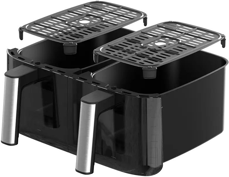 Teplovzdušná fritéza Double 8 l FR8000 je vybavená dvomi 4-litrovými fritovacími košmi, čo prináša množstvo výhod. Umožňujú prípravu dvoch rôznych jedál súčasne, čo šetrí čas a zvyšuje efektivitu varenia. Môžete napríklad pripravovať hlavný chod a prílohu naraz bez toho, aby sa chute alebo vône miešali. Tento praktický dizajn je ideálny pre rodiny a domácnosti, kde sa varí väčšie množstvo jedla, alebo pre tých, ktorí radi experimentujú s rôznymi receptami naraz.