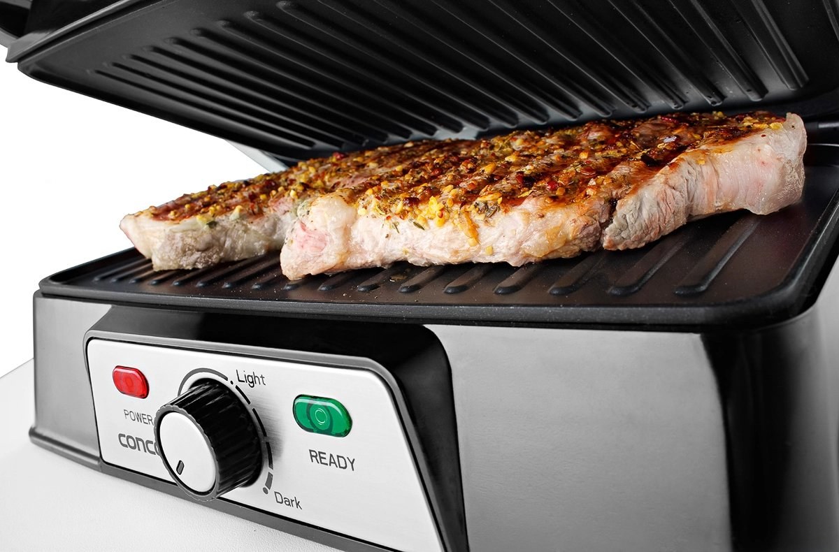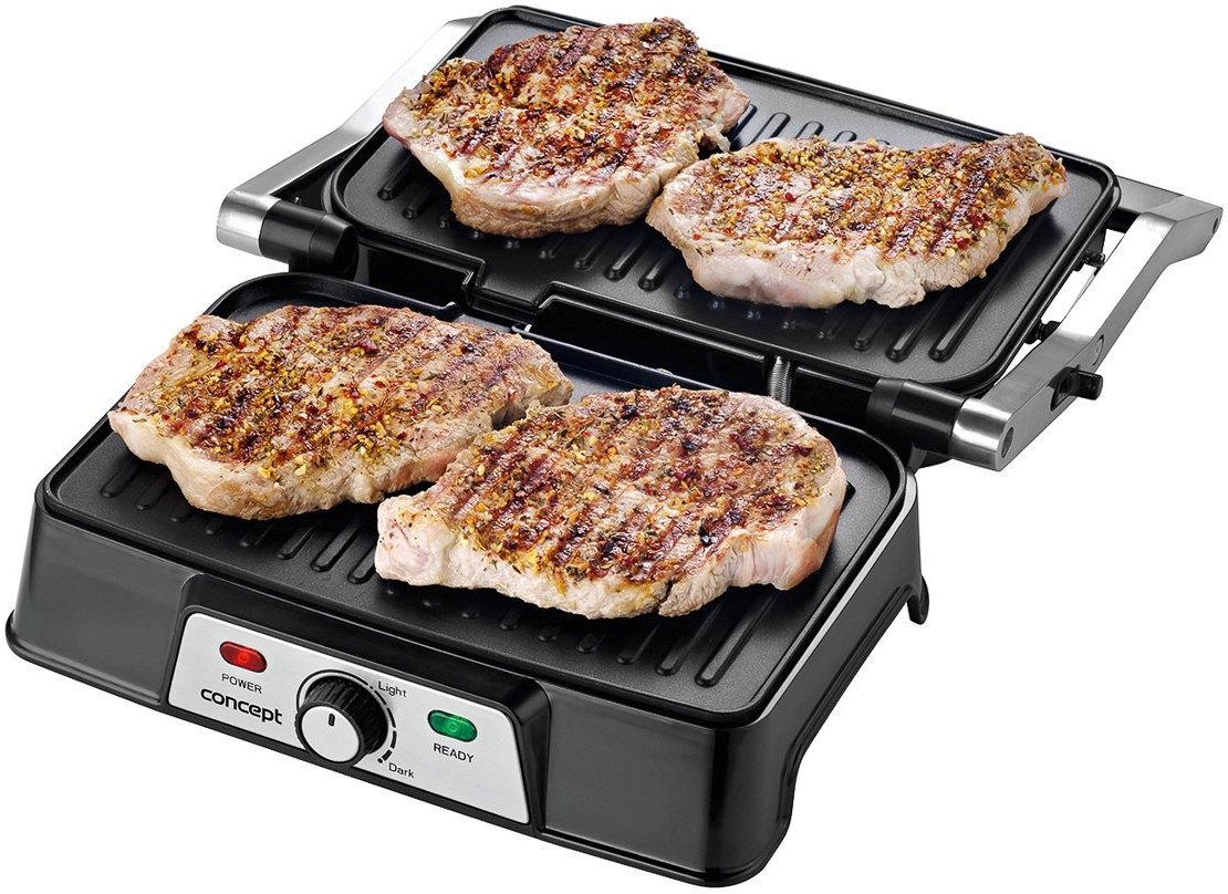 Príkon 1500 W umožní rýchle nahriatie grilu a umožní perfektné prepečenie aj vysokých steakov. Pomocou regulátora teploty si nastavíte vhodnú teplotu na prípravu rôznych druhov zeleniny, mäsa, ovocia a pod. Vaše steaky už nikdy nebudú príliš alebo málo prepečené. Kvalitné nepriľnavé liatinové platne zaistia Vášmu grilu dlhú životnosť. Môžete si pochutnávať na grilovaných dobrotách v každom ročnom období, pretože gril môžete používať doma aj vonku. Pri použití v domácnosti odporúčame gril postaviť pod odsávač. Údržba grilu je absolútne jednoduchá. Grilovacie platne stačí utrieť papierovou utierkou a Váš gril bude zasa ako zo škatuľky.