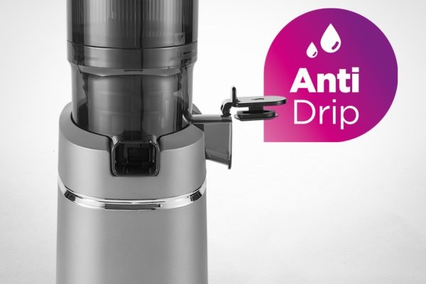 Odkvapový uzáver Anti Drip pomáha kontrolovať tok šťavy a zamedzuje jej odkvapkávaniu po skončení odšťavovania. Súčasne umožňuje ľahkú výmenu nádob na šťavu bez prerušenia procesu pri príprave väčšieho množstva šťavy. Vďaka proti odkvapovému uzáveru zostane vaša pracovná plocha vždy perfektne čistá.