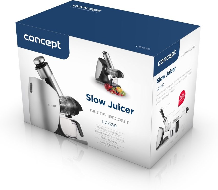 Odšťavovač Concept LO7250 Nutriboost je navrhnutý tak, aby pracoval veľmi ticho. S hlučnosťou iba 65 dB patrí medzi najtichšie modely vo svojej kategórii. Ovládanie prístroja je veľmi jednoduché vďaka jednej rýchlosti a spätnému chodu, ktorý slúži na uvoľnenie zablokovaných surovín.