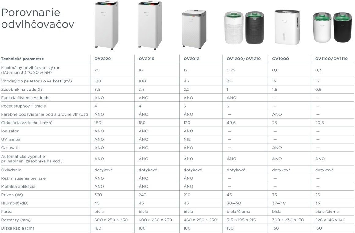 Nadmerná vlhkosť v domácnostiach znižuje nielen kvalitu bývania, ale má neblahý vplyv aj na naše zdravie. Vyššia vlhkosť je ideálnym prostredím pre rozvoj plesní, ktoré môžu spôsobiť zdravotné komplikácie. Model OV1200 je ideálny pre použitie v kúpeľni a v miestnostiach do veľkosti 25 m2. Ponúka 3 stupne rýchlosti výkonu a počas jedného dňa dokáže skondenzovať až 750 ml vody. Je vybavený zásobníkom na vodu s veľkosťou 1000 ml, po jeho naplnení sa prístroj automaticky vypne a rozbliká sa indikátor plnej nádoby. Odvlhčovač OV1200 môžete využiť tiež ako pomocníka pri sušení vypranej bielizne.