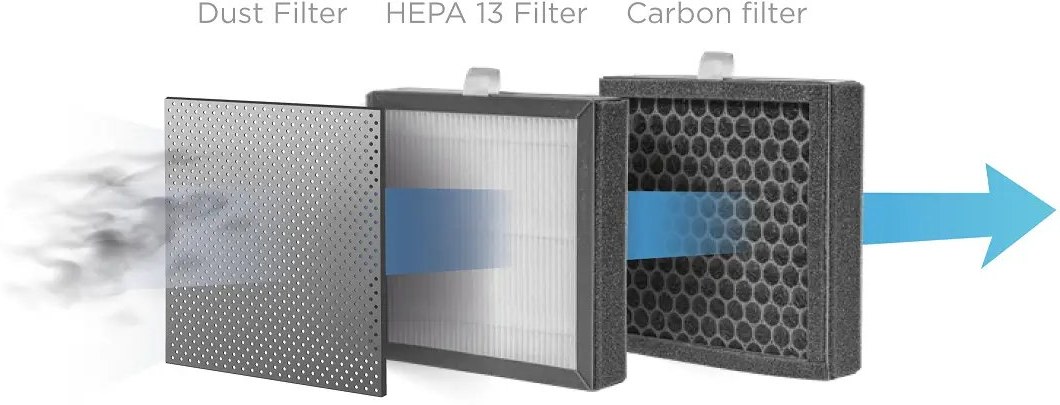 3-stupňová filtrácia odstráni až 99 % baktérií, vírusov, alergénov a pachov