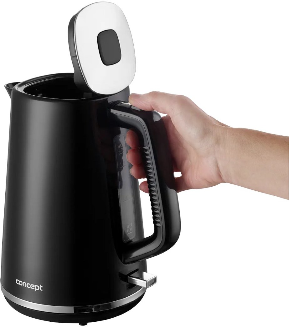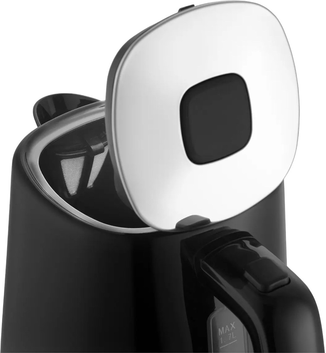 Kanvica je opatrená tlačidlom, ktoré umožňuje jednoduché a rýchle otvorenie veka jedným stlačením, čo zvyšuje užívateľský komfort pri plnení vodou. Hladké dno so skrytým vykurovacím telesom zamedzuje usadzovaniu nečistôt. Veľký vodoznak pod rukoväťou ponúka prehľad o množstve vody vo vnútri kanvice. Praktický je aj plne otočný podstavec s priestorom na uschovanie prebytočného kábla, na ktorý môžete kanvicu postaviť z akéhokoľvek uhla.