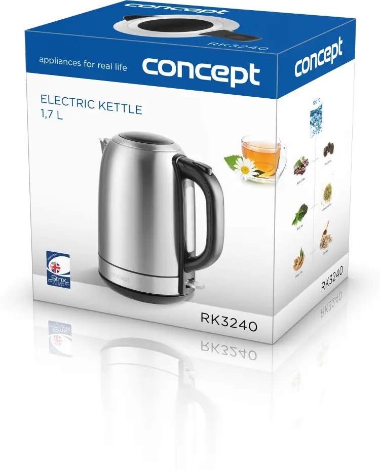 Kanvica RK3240 je osadená stredovým konektorom britskej značky STRIX, ktorý je zárukou vysokej kvality a predlžuje životnosť spotrebiča.