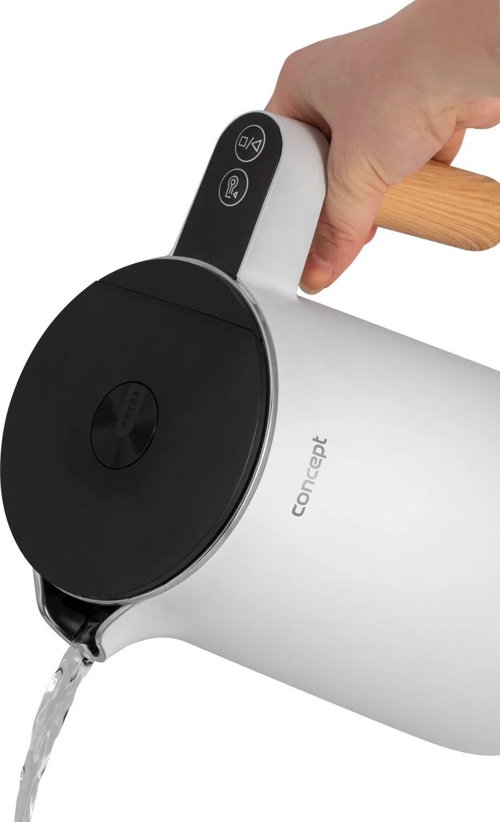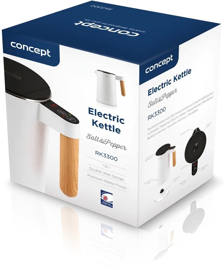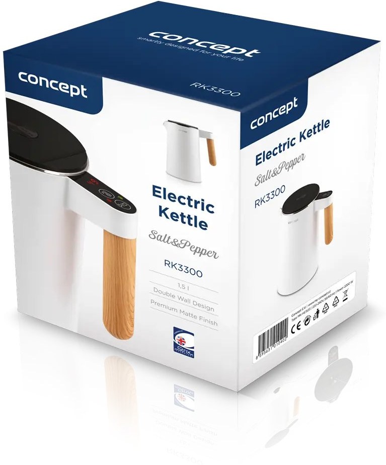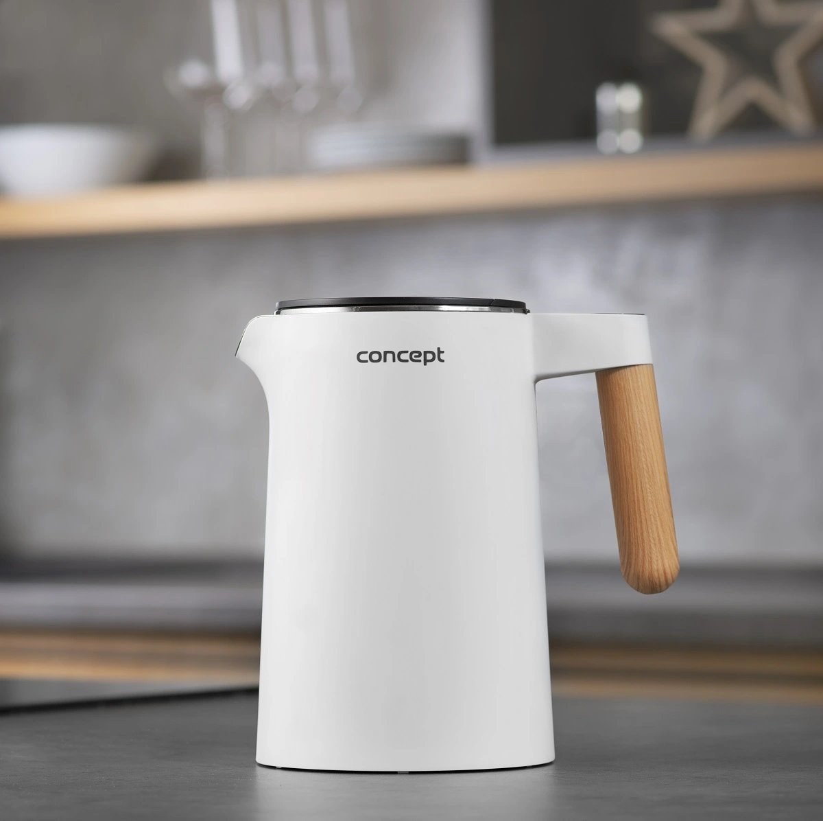 Rýchlovarná kanvica Concept RK3300 Salt & Pepper si nájde miesto v každej domácnosti. Jej atraktívny dizajn podtrhuj biele matené telo usadené na minimalistickom podstavci doplnené o elegantné madlo v dizajne dreva. S objemom 1,5 l s ňou pohodlne pripravíte až 6 šálok vášho obľúbeného horúceho nápoja.