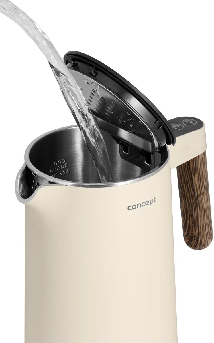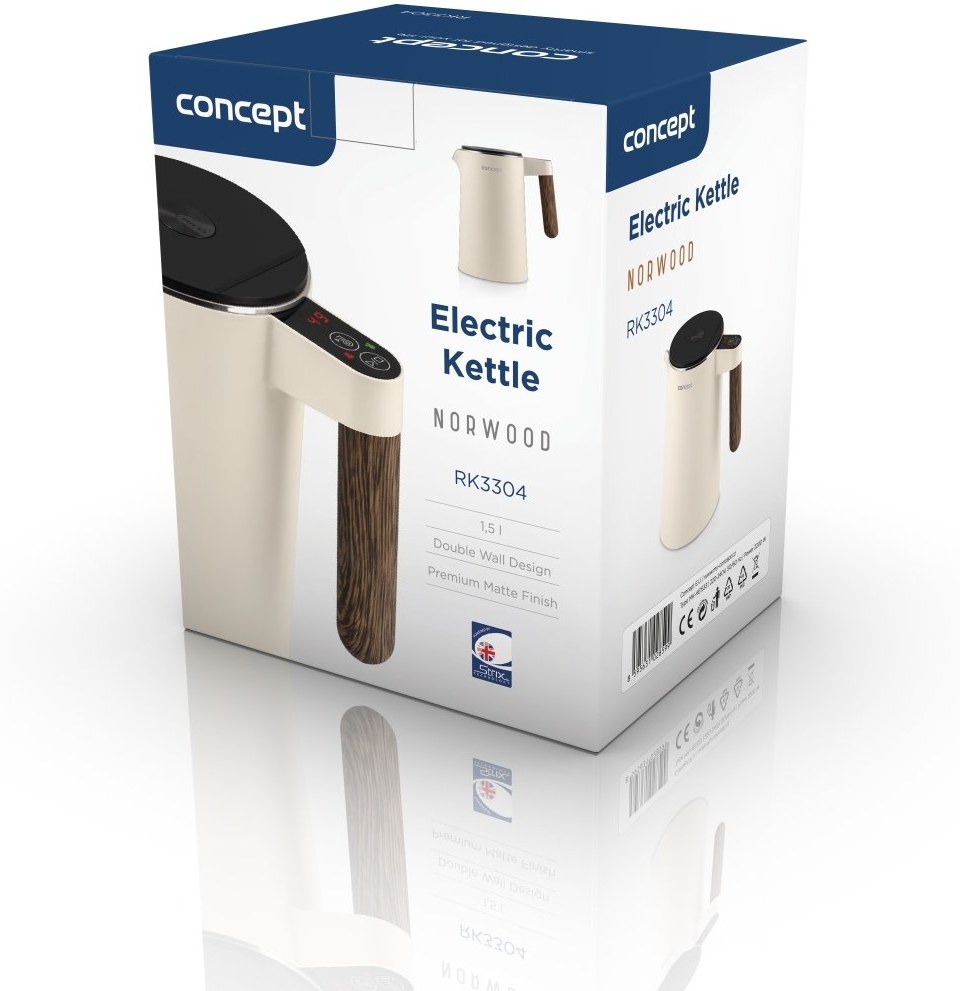 Rýchlovarná kanvica Concept RK3304 Norwood si nájde miesto v každej domácnosti. Jej atraktívny design podčiarkuje matné telo vo farbe vanilky doplnené o elegantné madlo v dizajne dreva. Veľmi elegantne pôsobí aj minimalistický podstavec, na ktorom je kanvica usadená. S objemom 1,5 l s ňou pohodlne pripravíte až 6 šálok vášho obľúbeného horúceho nápoja.