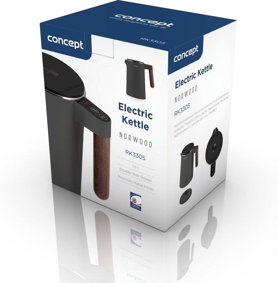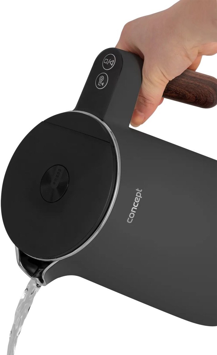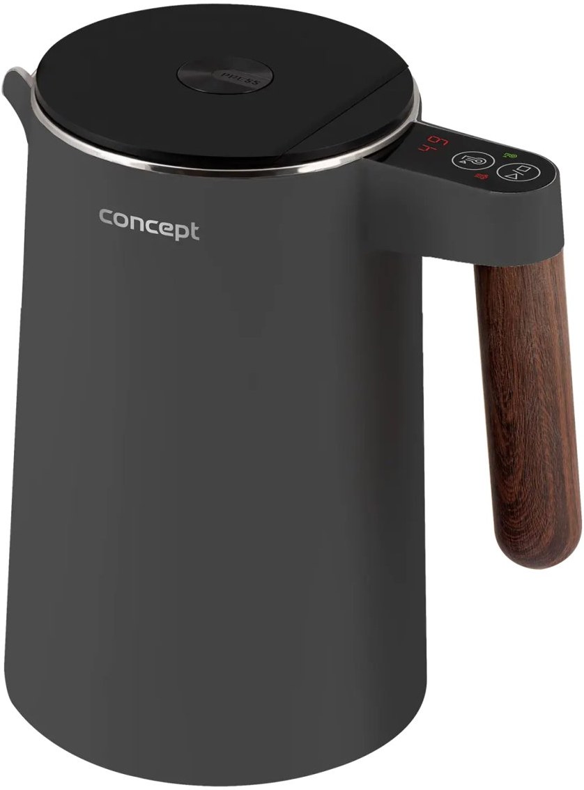 Rýchlovarná kanvica Concept RK3305 Norwood si nájde miesto v každej domácnosti. Jej atraktívny design podčiarkuje matné telo v tmavo šedej farbe doplnené o elegantné madlo v designe dreva. Veľmi elegantne pôsobí i minimalistický podstavec, na ktorom je kanvica usadená. S objemom 1,5 l s ňou pohodlne pripravíte až 6 šálok vášho obľúbeného horúceho nápoja.