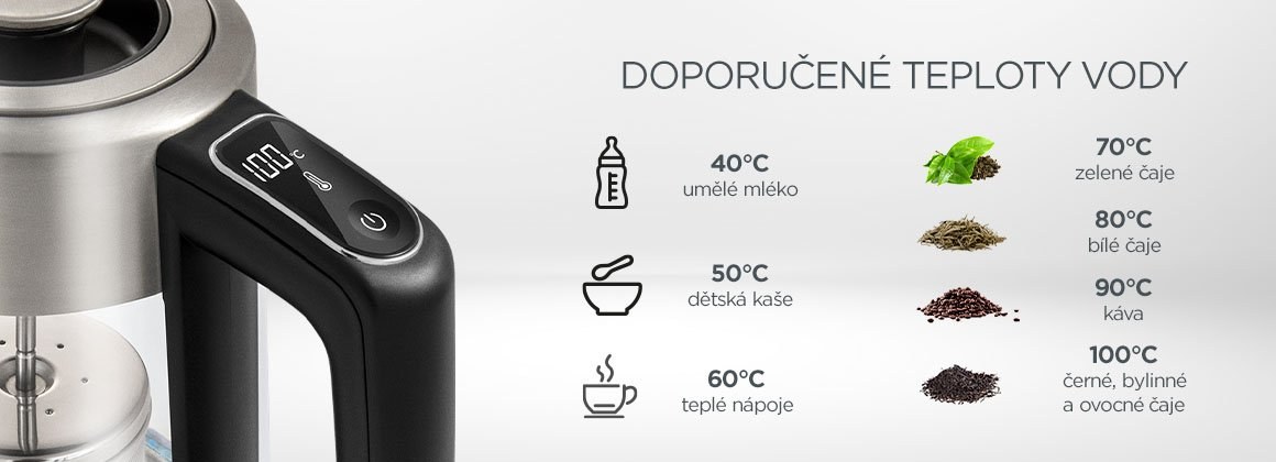s možnosťou regulácie teploty od 40 °C do bodu varu. To zaiste ocenia nielen čajoví a kávoví nadšenci, ale aj rodičia malých detí pri príprave detských príkrmov