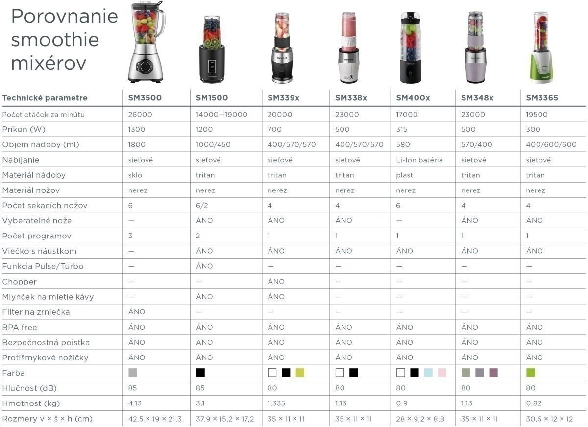 Smoothie FitMaker Concept SM4003 je pre každého, kto žije aktívnym životným štýlom a túži si ľahko a rýchlo pripraviť zdravé smoothie kedykoľvek a kdekoľvek. Disponuje integrovanou Li-Ion batériou, takže nie ste závislí na prítomnosti zásuvky. Vďaka svojmu kompaktnému a ľahkému spracovaniu sa pohodlne zmestí do batohu alebo kabelky a vy si ho tak môžete vziať kamkoľvek so sebou - na výlet, do práce alebo na cvičenie.