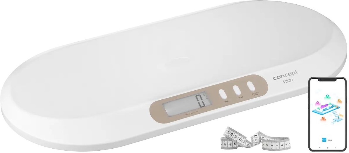 Detskú váhu Concept VD4000 KIDO môžete prepojiť cez Bluetooth s mobilnou aplikáciou Ailink, ktorá vám pomôže uchovávať namerané hodnoty. Aktuálnu váhu dokáže porovnať s poslednými nameranými hodnotami a poskytnúť okamžitý prehľad o vývoji vášho dieťaťa. Tieto hodnoty budú užitočné nielen pre vašu potrebu, ale i pre pediatra. Aplikácia pojme údaje až 8 užívateľov. Váhu teda môžete zdieľať v rámci celej rodiny a sledovať vývoj vlastných detí i ostatných ratolestí svojich blízkych. Okrem váhy, ktorá sa do aplikácie prepíše automaticky, môžete sledovať tiež výšku bábätka a obvod hlavy. Tieto údaje je však nutné zadať ručne. K zisteniu hodnôt môžete využiť meter, ktorý je súčasťou balenia.