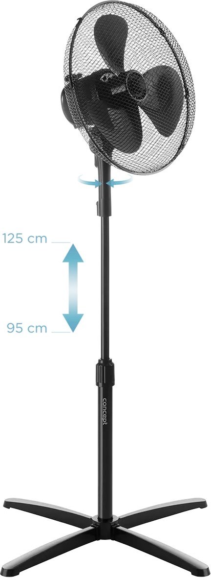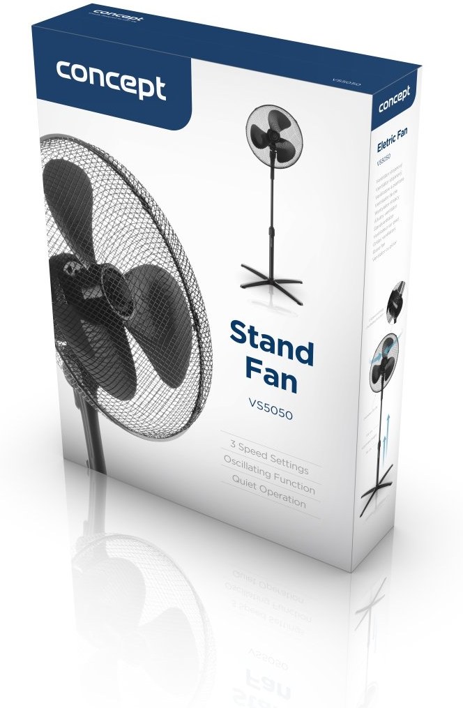 Stojanový ventilátor Concept VS5050 disponuje nastaviteľnou výškou a sklopnou vrtuľou na presné zacielenie prúdu vzduchu. Hlava ventilátora je osadená tromi lopatkami a umožňuje nasmerovanie podľa vašich potrieb - horizontálne aj vertikálne. Rovnomerné šírenie chladného vzduchu po miestnosti zaistí funkcia oscilácia s uhlom otáčania 80 ± 5 °.
