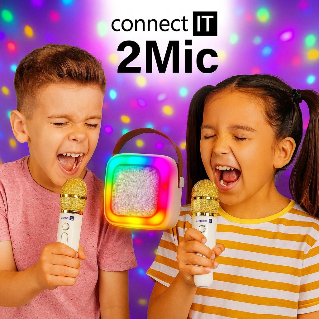 Bezdrôtový reproduktor CONNECT IT 2Mic s dvoma mikrofónmi pre nekonečné množstvo karaoke zábavy.Predný panel disponuje farebným LED podsvietením s možnosťou prepínania niekoľkých svetelných módov av hornej časti reproduktora sa nachádzajú všetky potrebné ovládacie tlačidlá. Vďaka dvom mikrofónom s niekoľkými zvukovými efektmi si užite množstvo zábavy s priateľmi.