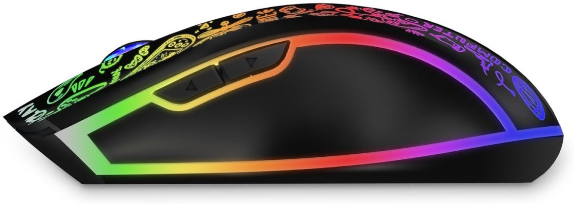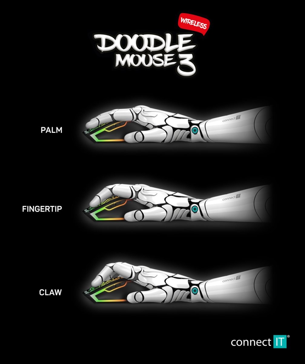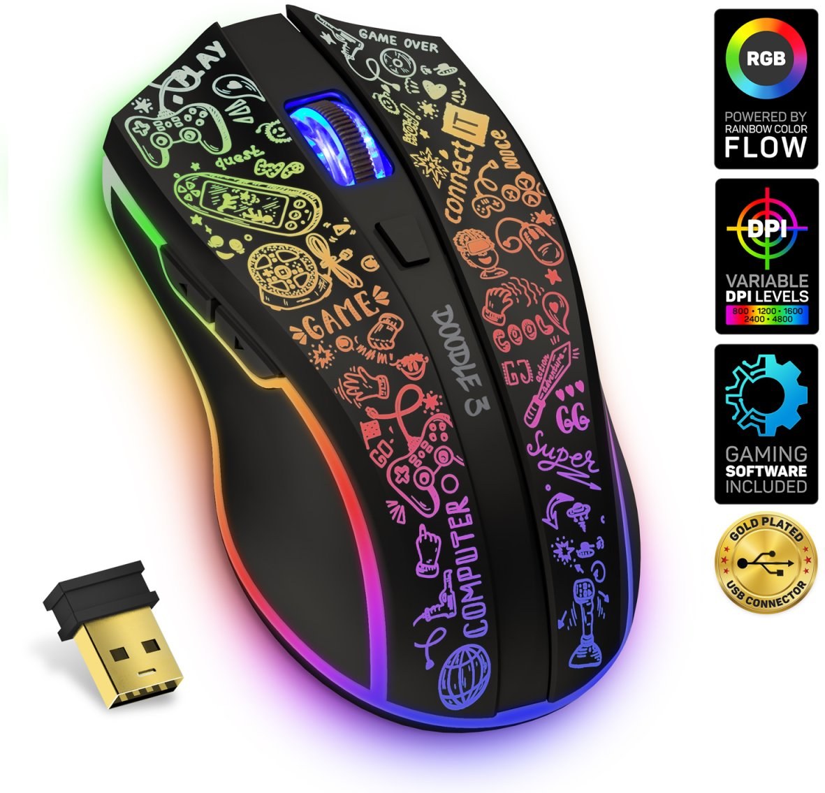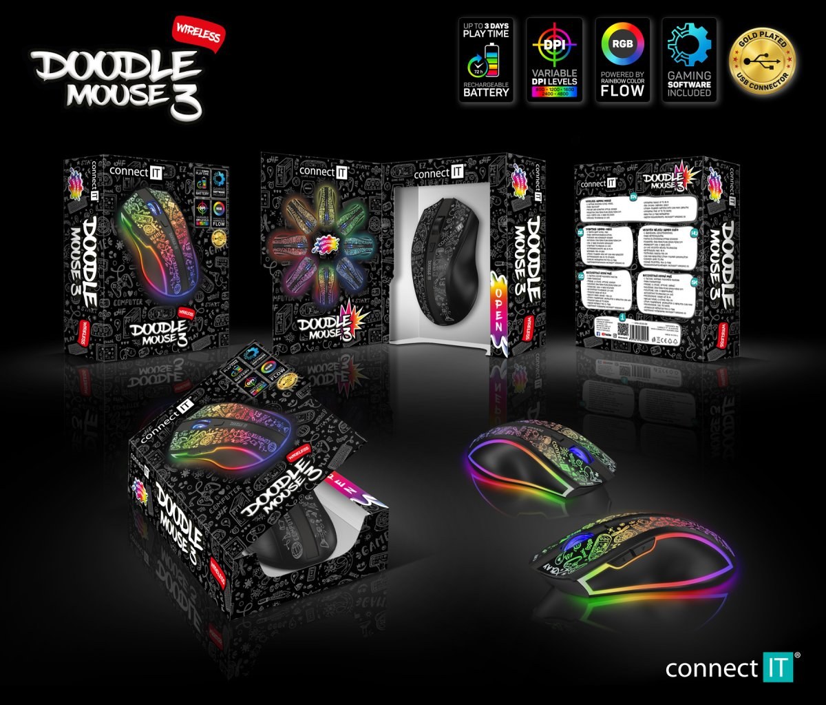 Profesionálna bezdrôtová gamingová myš DOODLE 3 pre hráčov počítačových hier s Rainbow podsvietením tela aj kolieska v mixe 7 farieb. Dodávaný SW s početnými nastaveniami podporuje užívateľské makrá, 5 užívateľských profilov a 6 programovateľných tlačidiel vrátane posuvného kolieska. Precízny optický senzor má nastaviteľnú citlivosť až na 4800 DPI.Myš využíva technológie ako povrchový RubberGrip na elimináciu kĺzavosti dlane, UltraSlides Black pojazdy pre maximálnu možnú rýchlosť na podložke. Nechýba ani technológia AutoPowerSave šetriaca kapacitu batérie. Softvér je zadarmo na stiahnutie na stránkach www.connectit-europe.com. Vysokú odolnosť garantujú špičkové mechanické spínače Huano so životnosťou 3 milióny kliknutí. Samozrejmosťou je pozlátený USB Nano prijímač a dodávaný nabíjací kábel.