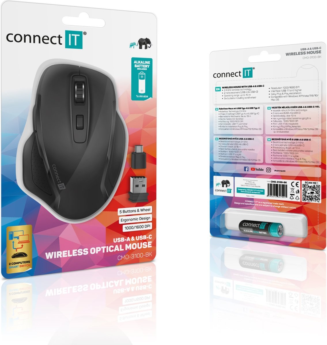Kancelárska bezdrôtová myš s dvoma USB Nano prijímačmi (USB-A a USB-C], šiestimi tlačidlami a precíznym senzorom. Bezdrôtová optická myš s unikátnou funkciou SmartSwitch, vďaka ktorej môžete používať myš striedavo na dvoch počítačoch alebo notebookoch a ľubovoľne sa medzi nimi prepínať. Táto funkcia sa hodí do domáceho aj profi kancelárskeho prostredia, kde sa pracuje s jednou myšou striedavo na dvoch počítačoch alebo notebookoch. Jedinečný dizajn myši dovoľuje uschovať oba USB Nano prijímače pod krytkou batériového priestoru v spodnej časti myši a zabrániť tak ich strate. Súčasťou balenia je originálna alkalická ceruzková batéria CONNECT IT.Vlastnosti