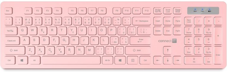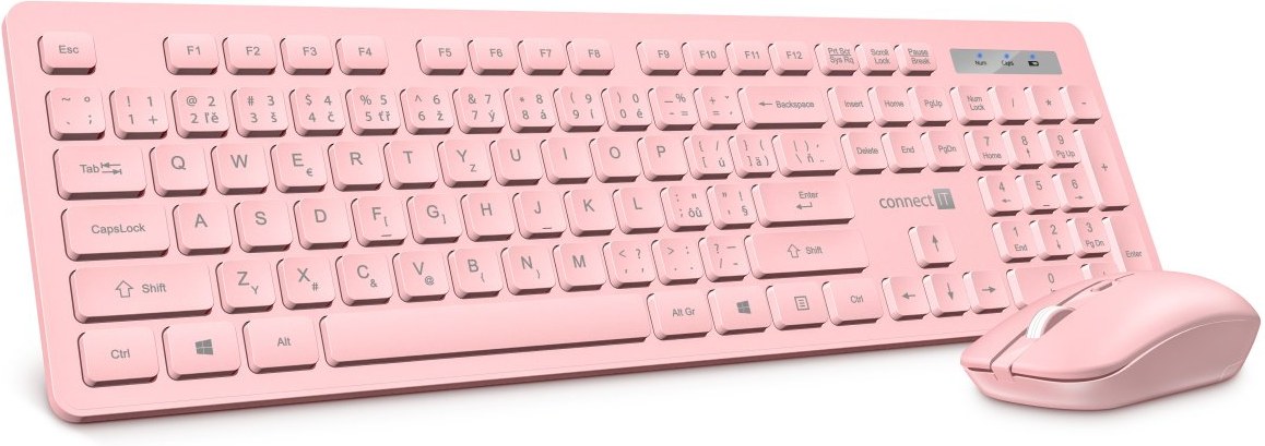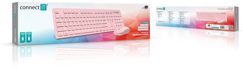Bezdrôtová klávesnica a optická myš v elegantnom ružovom dizajne, určená na domáce aj profesionálne použitie v kanceláriách a firmách.Klávesnica je výškovo polohovateľná a ponúka nízky profil klávesov. Myš disponuje rozlíšením až 1600 DPI. Set klávesnice a myši využíva technológiu jedného nano prijímača, vďaka ktorej Vám zaistí úsporu USB-A portov vo Vašom zariadení. Súčasťou balenia sú aj originálne alkalické ceruzkové batérie CONNECT IT (1x AA + 1x AAA). Samozrejmosťou je veľmi jednoduchá inštalácia, vďaka Plug & Play.