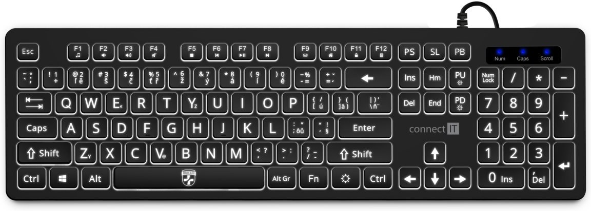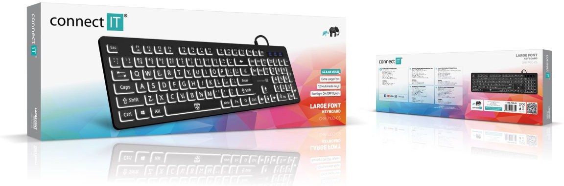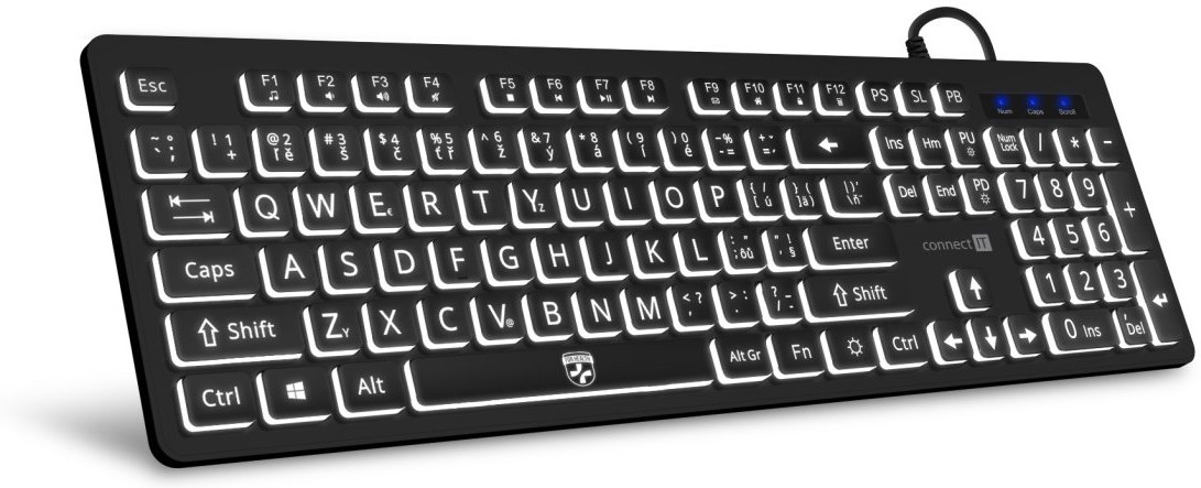 Unikátna podsvietená klávesnica s veľkým fontom pre lepšiu čitateľnosť ocenia nielen užívatelia s horším zrakom či zrakovým postihnutím, ale aj seniori a deti.Klávesnica okrem klasických funkcií disponuje 12 multimediálnymi klávesmi, ktoré využijete ako v domácom, tak v kancelárskom prostredí. Príjemný ergonomický náklon klávesnice pomáha proti únave zápästia počas dlhých pracovných reláciách.
