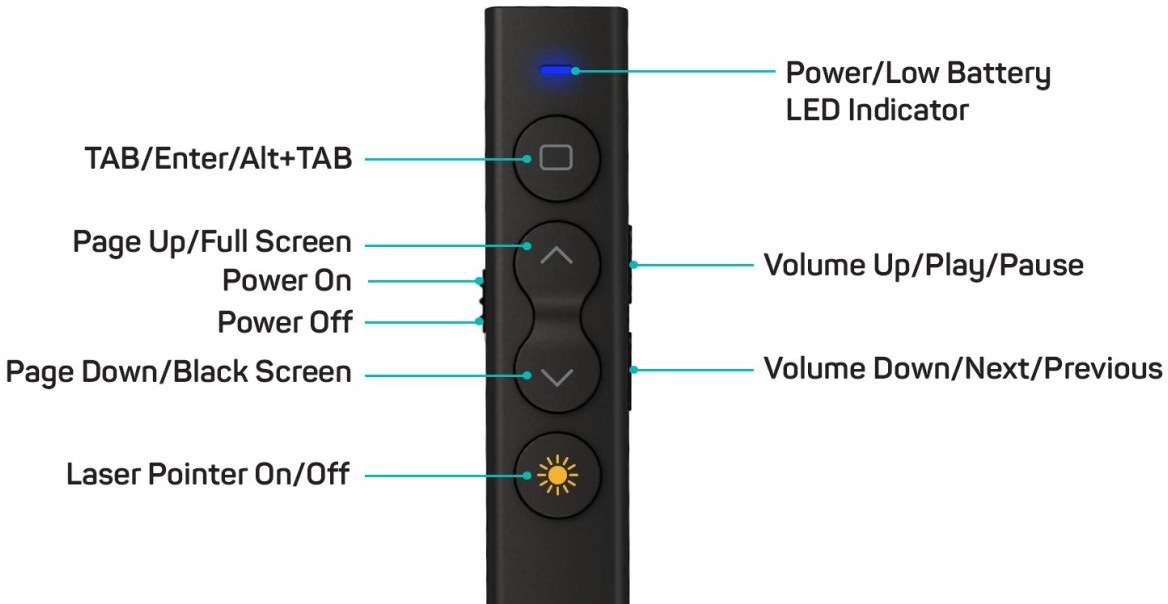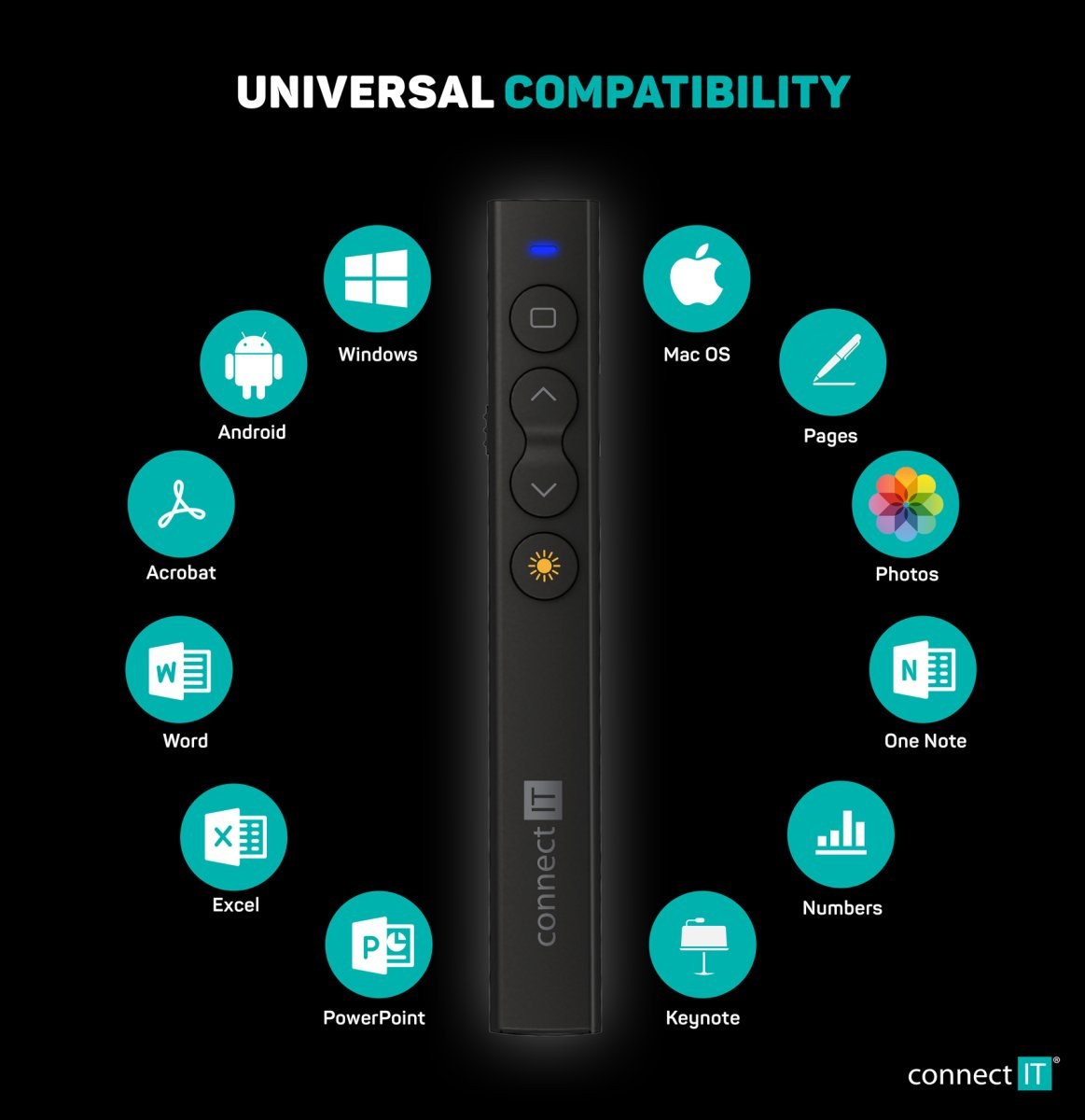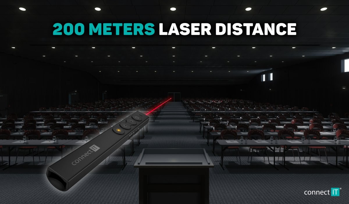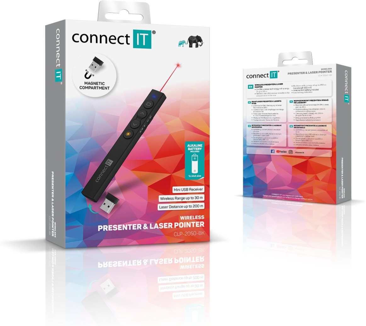 Bezdrôtový prezentér s laserovým ukazovátkom CLP-2050-BK vyniká bezdrôtovým dosahom až 30 metrov a obdivuhodným dosahom lasera 200 metrov s dvojnásobne lepšou viditeľnosťou oproti bežným laserom.Optimálna kombinácia bezdrôtového prezentéra a laserového ukazovátka z vás urobí profesionála na akejkoľvek porade, prednáške alebo prezentácii. Zamilujete si ho vďaka jeho nízkej hmotnosti a perfektnému štíhlemu tvaru padnúcemu do každej ruky. V zadnej časti sa nachádza praktická schránka na USB prijímač, ktorý už nikdy nestratíte.