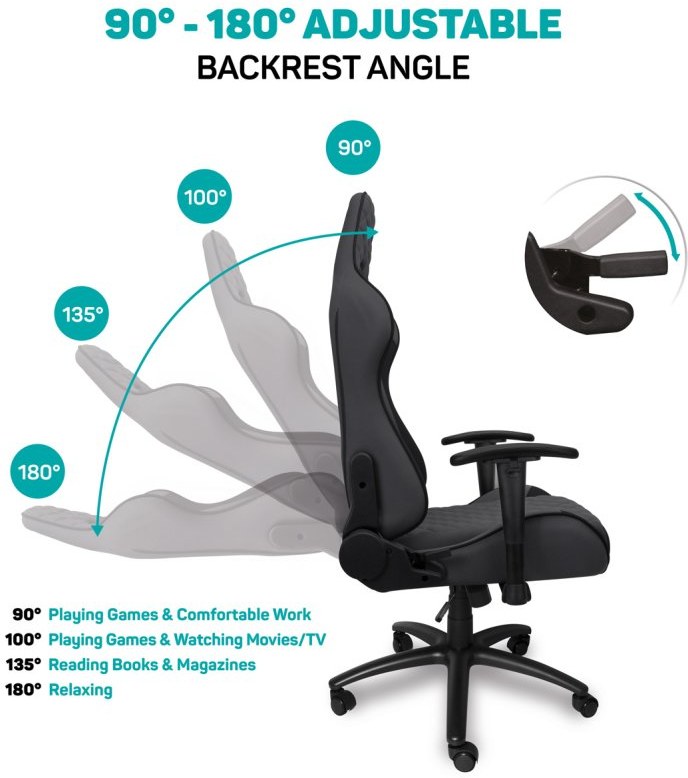 hráčske kreslo, široké možnosti nastavenia, ergonomicky tvarované, doplnkový vankúš za chrbticu, nastavenie sklonu uhla 180°, nosnosť do 150 kgZobraziť viac
