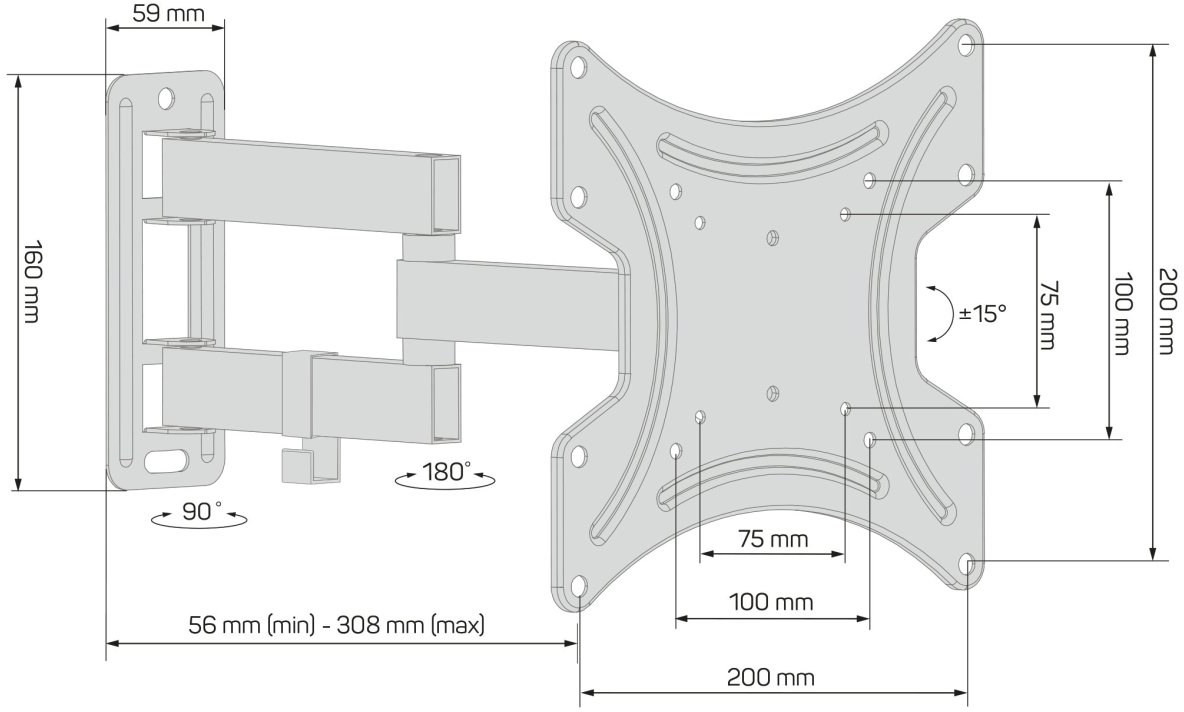 Rozmery držiaka pri maximálnej vzdialenosti od steny (šxvxh): 220 x 220 x 308 mm