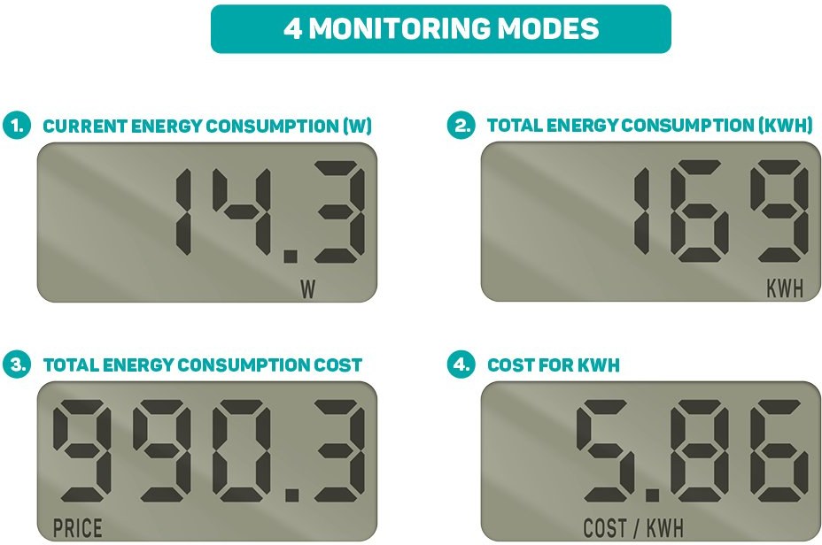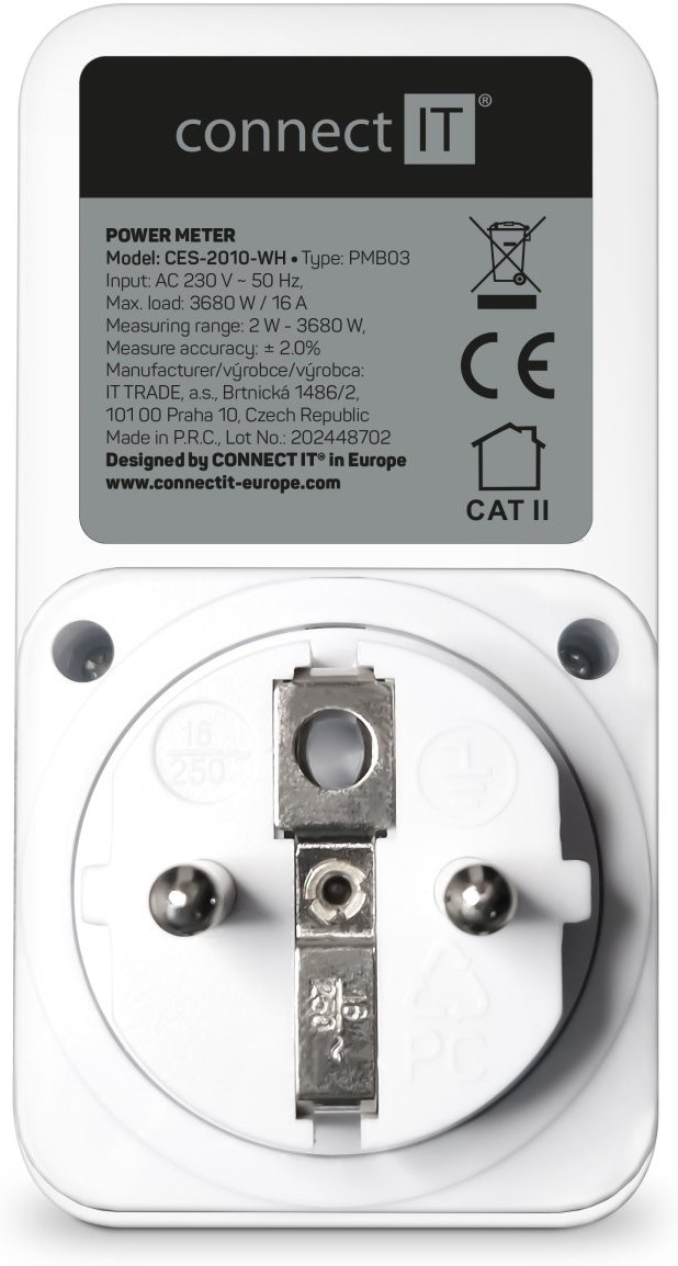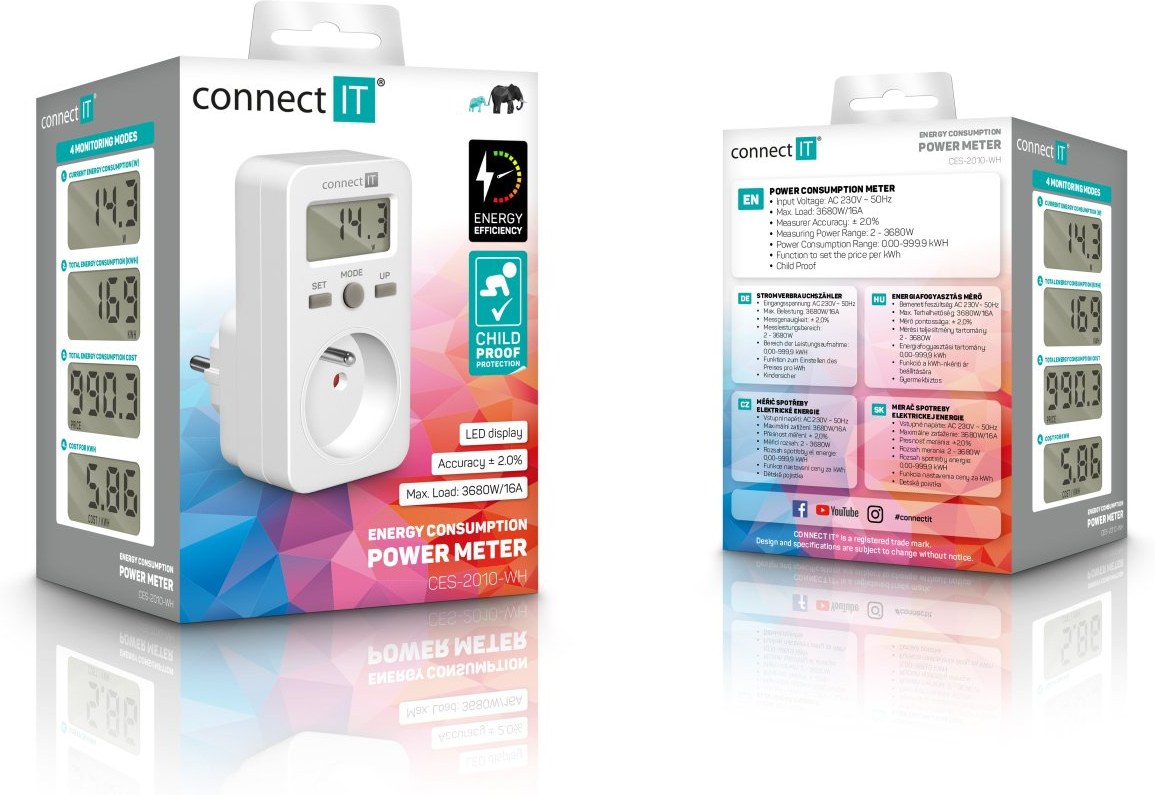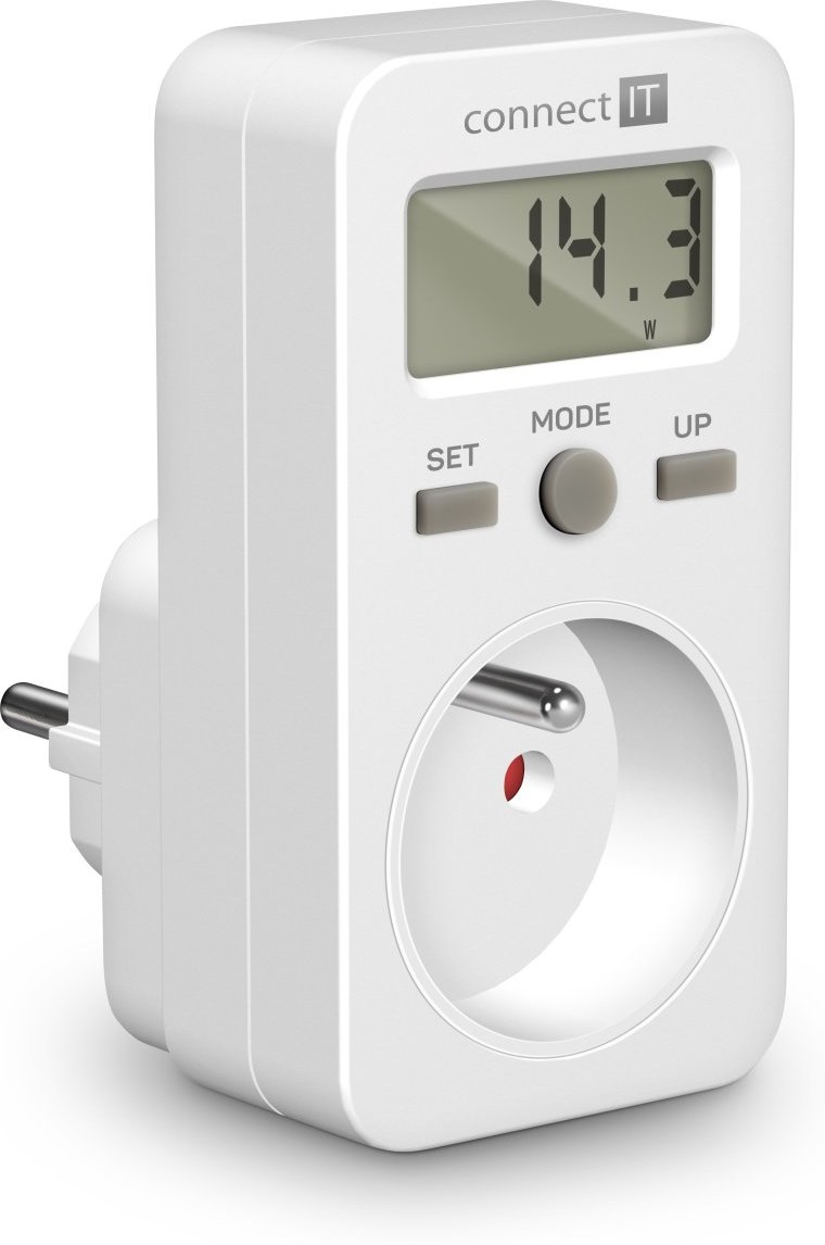 Digitálny merač CONNECT IT "PowerMeter" s jednoduchým dizajnom slúži na meranie spotreby elektrickej energie rôznych domácich spotrebičov. Merač disponuje veľkým LED displejom a jednoduchým ovládaním. Vďaka tomu je veľmi prehľadný a spoľahlivý.Merač spotreby elektrickej energie dokáže vypočítať zodpovedajúce finančné náklady a odhaliť, ktorý spotrebič odoberá najviac elektrickej energie a jeho prevádzka je teda najnákladnejšia. Medzi ďalšie funkcie merača patrí meranie okamžitého odoberaného výkonu. Tieto informácie Vám môžu prispieť k zníženiu nákladov za elektrickú energiu. Merač je vybavený internou pamäťou na uloženie nastavenia a údajov v prístroji.