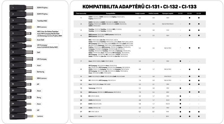 Výstup: 12/15/16/18(18,5)/19(19,5)/20/24 V DC