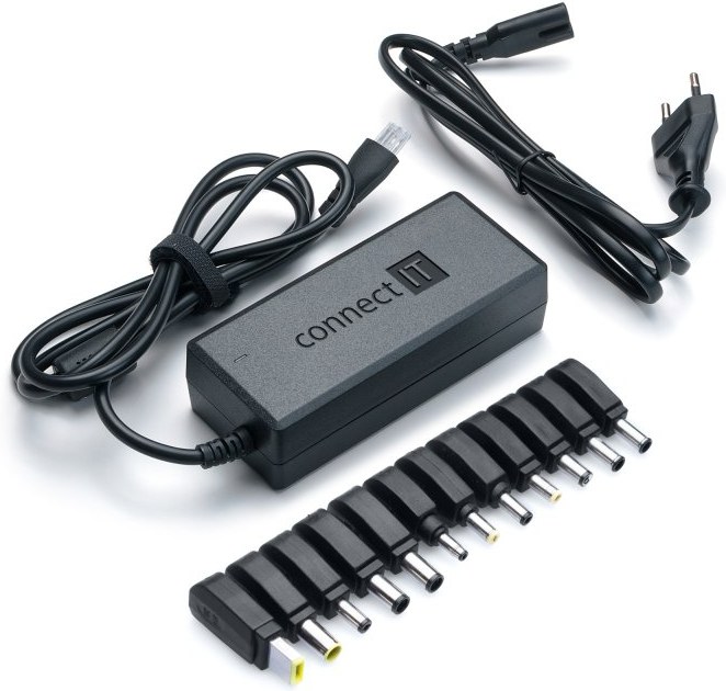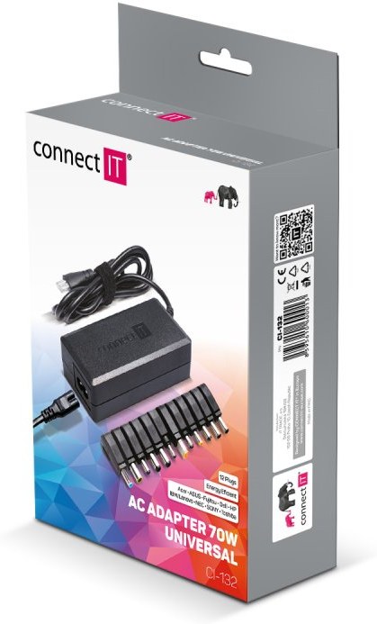 CONNECT IT univerzálny notebookový adaptér 70 W. Správnu funkciu adaptéra signalizuje LED kontrolka. Adaptér je vybavený ochranami proti prepätiu, nadprúdu a skratu, ktoré bránia poškodeniu vášho notebooku a vďaka svojim kompaktným rozmerom ho môžete vziať vždy so sebou a napájať svoj notebook kedykoľvek budete potrebovať. Súčasťou balenia je 12 vymeniteľných koncoviek s praktickým držiakom.Ultrakompaktný prevedení. Univerzálny napájací adaptér pre notebooky značiek SONY, Fujitsu, Toshiba, NEC, Lenovo, IBM, Lite-On, Delta, Acer, ASUS, DELL, Getaway, HP, Compaq.