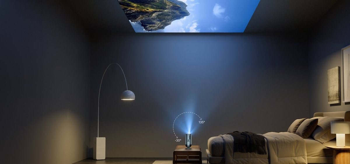 Jednou z najvýraznejších vlastností modelu Freedo je jeho inovatívny dizajn s výklopným stojanom (gimbal stand). Tento mechanizmus umožňuje plynulé nakláňanie projektora v rozsahu až 165 stupňov. V praxi to znamená, že obraz môžete smerovať nielen na stenu, ale napríklad aj priamo na strop, čo oceníte pri pohodlnom sledovaní filmov priamo z postele. Stojan je navyše mimoriadne stabilný a eliminuje potrebu používať dodatočné statívy alebo provizórne podkladanie projektora knihami, aby ste dosiahli ideálny uhol pohľadu.
