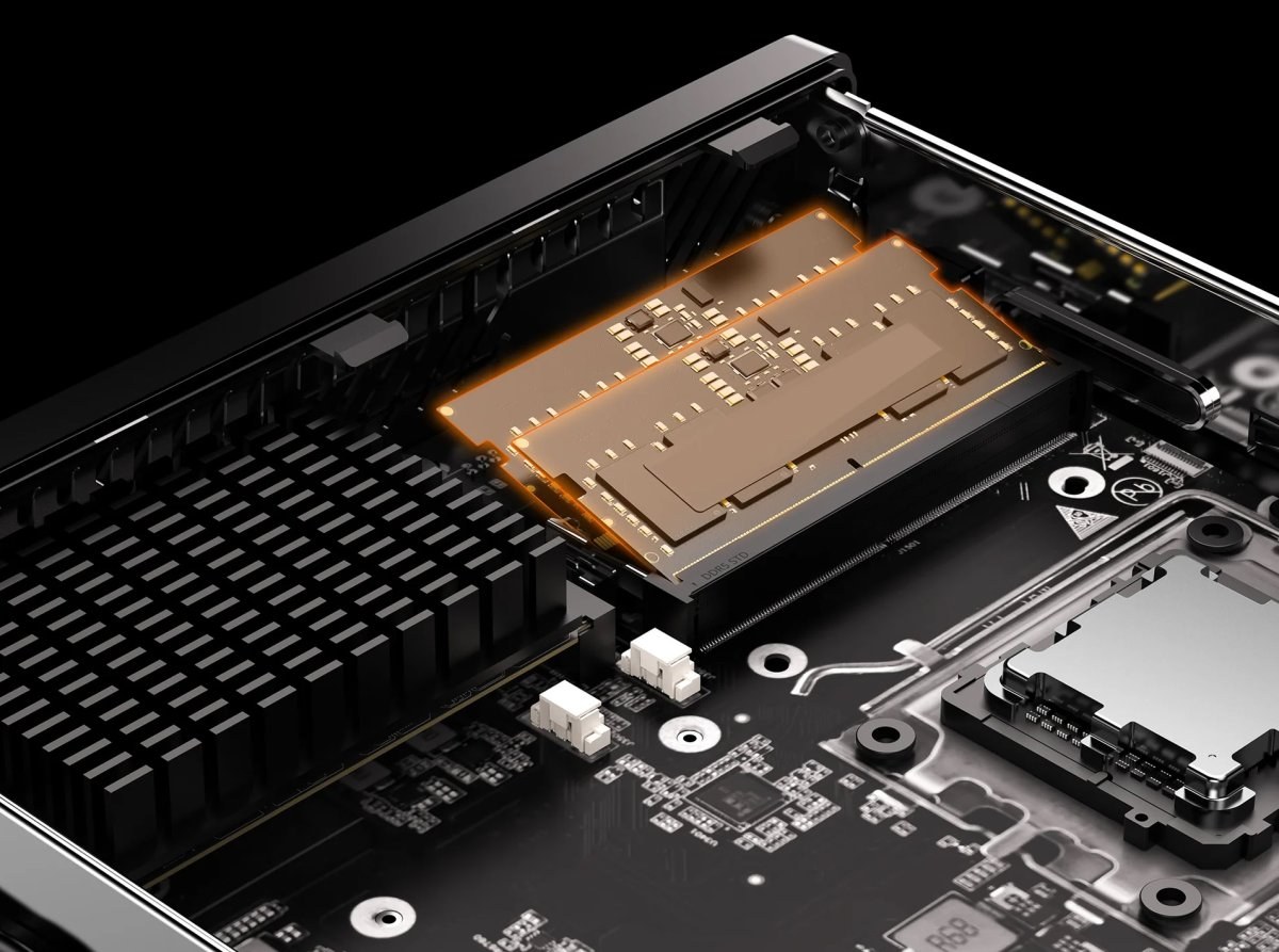 Zariadenie podporuje až 96 GB DDR5 RAM v dvojkanálovom zapojení a ponúka štyri M.2 PCIe 4.0 sloty pre NVMe SSD disky. To umožňuje vytvoriť extrémne rýchle a kapacitne bohaté úložisko, ideálne pre prácu s veľkými súbormi, virtualizáciu alebo multimediálnu produkciu. Vnútorný priestor je optimalizovaný pre jednoduchú inštaláciu a výmenu komponentov.