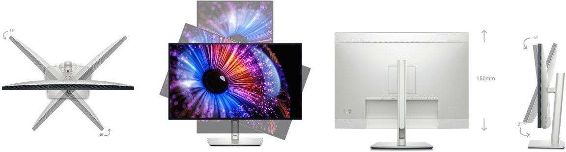 Dell UltraSharp U2724D má ergonomický stojan, ktorý podporuje plný rozsah nastavení: výšku, náklon, otáčanie a pivot. Môžete si tak prispôsobiť polohu monitora podľa svojich preferencií a potrieb. Monitor je tiež kompatibilný so štandardom VESA 100 x 100 mm, takže ho môžete namontovať na stenu alebo na iný držiak.