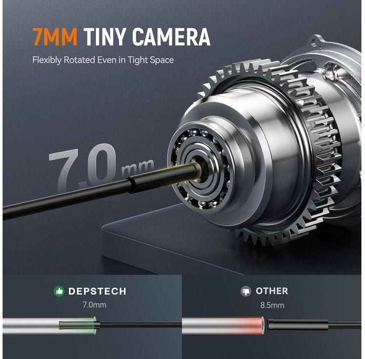 Tento špičkový inšpekčný endoskop je vybavený 2MP snímačom CMOS, ktorý v kombinácii s patentovanou technológiou Bluart Tech poskytuje čisté zobrazenie a vysokú rýchlosť spracovania umožňujúcu presné inšpekcie. Kamera endoskopu je určená predovšetkým na prezeranie na krátku vzdialenosť, najlepšia ohnisková vzdialenosť je asi 3–10 cm. Polotuhá hadia kamera s malou 7mm sondou sa môže ľubovoľne ohýbať a bez problémov kontrolovať rôzne úzke miesta, čo z nej robí ideálny nástroj pre rôzne priemyselné aplikácie, ako je údržba automobilov, inštalatérstvo a bežné kontroly v domácnosti.Môže vám tiež ušetriť veľa práce, kedykoľvek niečo hľadáte. Ušetrí vám rozoberanie všetkého možného a zvýši efektivitu vašej práce. Integrovaný IPS displej ponúka vynikajúcu čistotu a reprodukciu farieb a zaisťuje jasný prehľad o kontrolovanom priestore. Ďalšou prednosťou je ľahké ovládanie, stačí len zapnúť a všetko preskúmať, nie je potrebné dátové pripojenie ani aplikácie. Endoskop D360 je možné použiť na prezeranie v reálnom čase, ale rovnako dobre poslúži na záznam fotografií alebo videí na priloženú SD kartu.