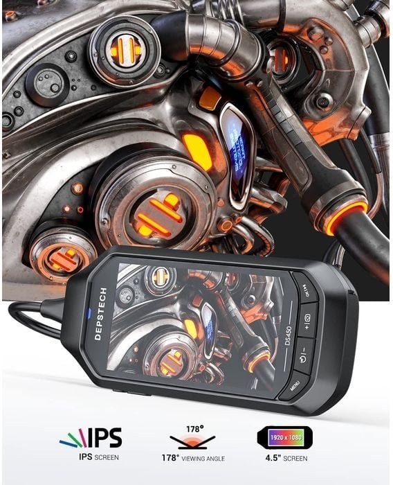 Priemyselná duálna inšpekčná kamera (endoskop) DS450–5DL od spoločnosti Depstech s dvoma širokouhlými objektívmi so 70° uhlom záberu (predný a bočný) a pokročilým 4,5" displejom IPS umožňuje analýzu akéhokoľvek obmedzeného priestoru v reálnom čase a okamžité zobrazenie fotografií a videí s rozlíšením až 1080p (Full HD). Vysokokvalitné osvetlenie scény zabezpečuje 7 LED diód (6 predných, 1 bočná) s technológiou Bluart 2.0 na optimálnu expozíciu v zlých optických podmienkach. Rýchle prepínanie medzi prednými a bočnými kamerami umožňuje zaznamenávať situáciu v plnom zábere, čo je užitočné najmä v tesnejších a komplikovanejších miestach, ako je napríklad vnútro potrubia alebo ventily valcov automobilov. Nie je potrebná žiadna aplikácia, smartfón, Bluetooth ani WiFi. Ovládanie je veľmi jednoduché, po pripojení endoskopu ho môžete okamžite používať (Plug and Play).4,5" farebná obrazovka IPS