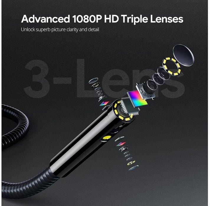 Inšpekčná kamera s revolučnou 7" ultraširokouhlou IPS obrazovkou. Vďaka veľkému, krištáľovo čistému displeju uvidíte viac detailov naraz s ohromujúcou jasnosťou a presnosťou, čo znižuje potrebu opakovaných inšpekcií a zvyšuje efektivitu práce. Technológia IPS zaisťuje lepšiu presnosť farieb a širšie pozorovacie uhly. ďalej ponúkne tri objektívy s vlastným osvetlením, čo z nej robí nevyhnutnú pomôcku pre profesionálnych mechanikov, inštalatérov i domácich majstrov. Trojité objektívy zachytávajú obraz z rôznych uhlov, čo umožňuje komplexnejší pohľad na oblasť inšpekcie.