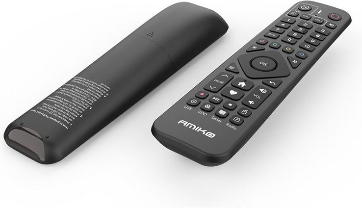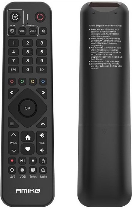 Náhradný IR diaľkový ovládač k Android prijímačom Amiko A4/A5/A6/A9 s možnosťou naprogramovať ovládanie TV (zapnutie/vypnutie, hlasitosť +/- a voľba vstupu).