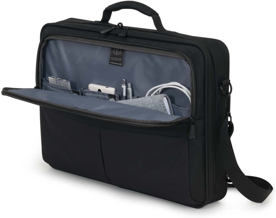 Taška na notebook do uhlopriečky 14,1" , vyrobená z recyklovaných PET fliaš s ohľadom na životné prostredie. Hlavná priehradka s penou s vysokou hustotou (HDF), rámom vystuženým kovom a spoľahlivým fixačným popruhom ponúka trojitú ochranu vášho zariadenia. Priestranné predné vrecko vám pomôže pri je tiež priehradka pre tablet do veľkosti až 12,9" a priehradka na dokumenty na zadnej strane. Taška sa pohodlne nosí vďaka nitovanej rukoväti a nastaviteľnému ramennému popruhu.Vlastnosti