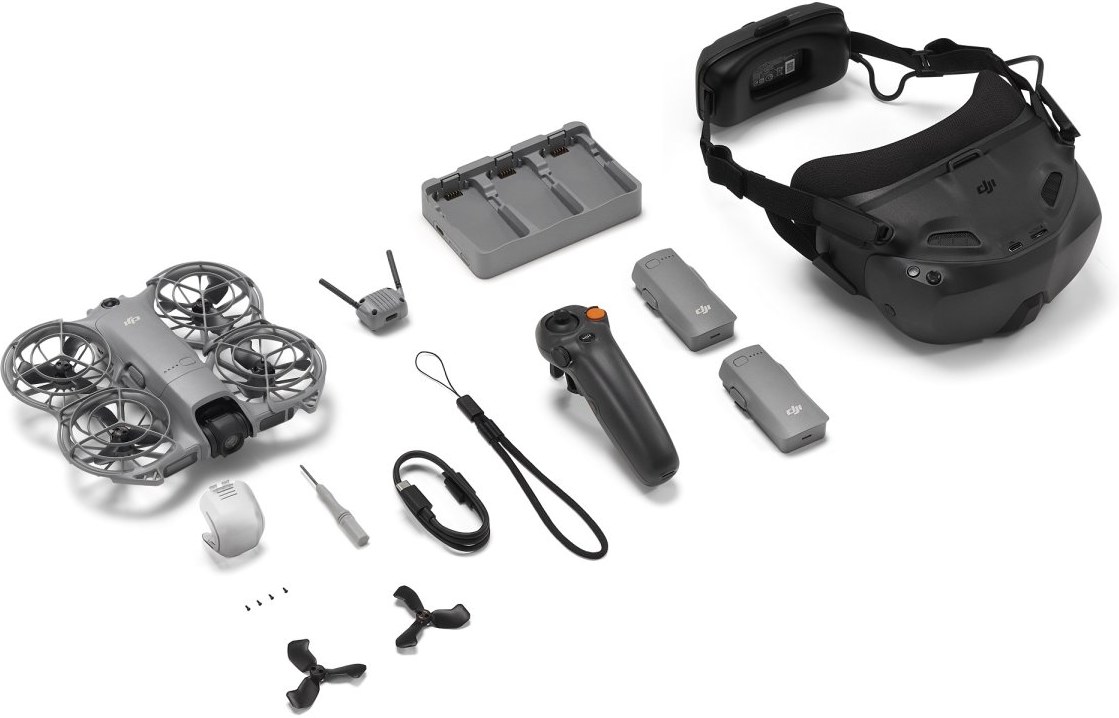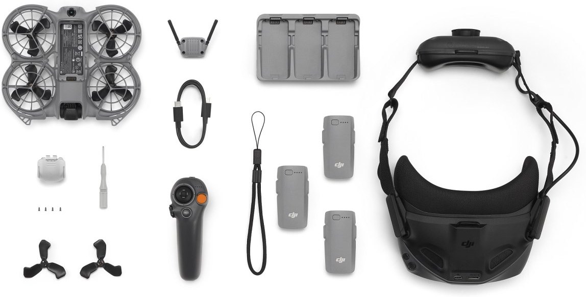 Fly More Combo obsahuje RC Motion 3, ktorý prináša úplne nový spôsob ovládania dronu pomocou pohybov ruky. Tento ovládač je ľahký, ergonomický a vybavený dvojstupňovou spúšťou pre presné manévrovanie. V kombinácii s DJI Goggles 3 poskytuje pohlcujúci FPV zážitok a umožňuje funkcie ako Easy ACRO či AR Cursor. Okrem toho môžete Neo 2 ovládať cez DJI Fly aplikáciu, hlasové príkazy alebo klasický RC ovládač.