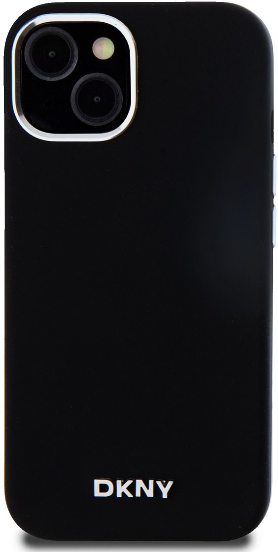 DKNY Liquid Silicone Silver Metal Logo Magsafe kryt pre iPhone 15, čierny