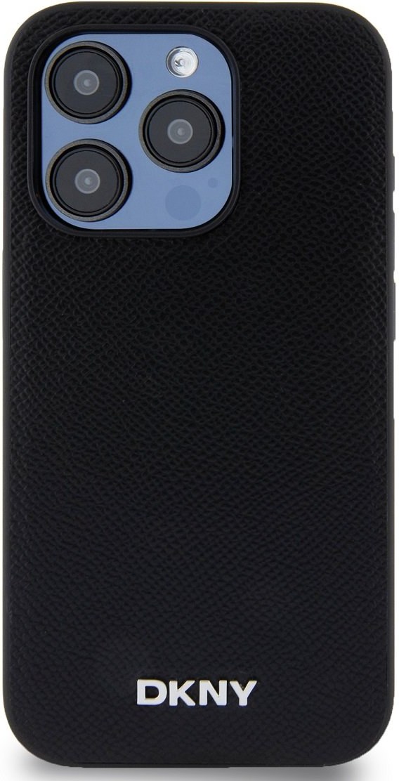 DKNY PU Leather Silver Metal Logo Magsafe kryt pre iPhone 15 Pro, čierny