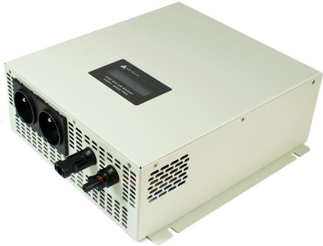Striedač ECO Solar Boost MPPT-3000 PRO umožňuje priame použitie systémov fotovoltaických panelov na napájanie odporových vykurovacích zariadení, ako sú elektrokotle, ohrievače, vykurovacie rohože atď.Systém je jednoduchý, vyžaduje iba pripojenie zodpovedajúceho počtu (od 4 do 9 kusov) typických fotovoltaických panelov s prevádzkovým napätím cca 35V alebo zodpovedajúci počet ďalších a energetický prijímač, napr. elektrokotol, podlahový vykurovanie atď.