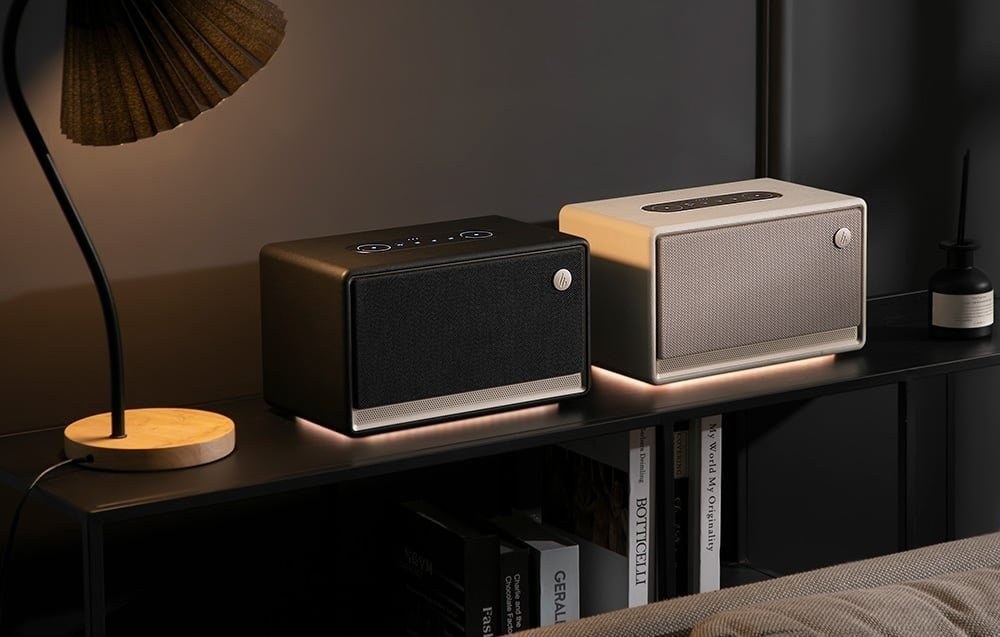Drevená 15 mm MDF skrinka v retro štýle znižuje rezonancie a dodáva nadčasový vzhľad. Textilný poťah a čistý dizajn pôsobia elegantne, zatiaľ čo trojrežimové ambientné podsvietenie dotvára atmosféru podľa nálady.Vlastnosti