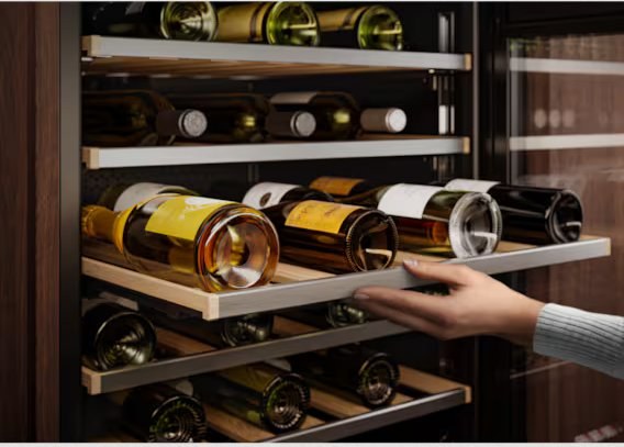Vysúvateľné drevené poličky na teleskopických lištách znamenajú jednoduchý a efektívny prístup k vínu.