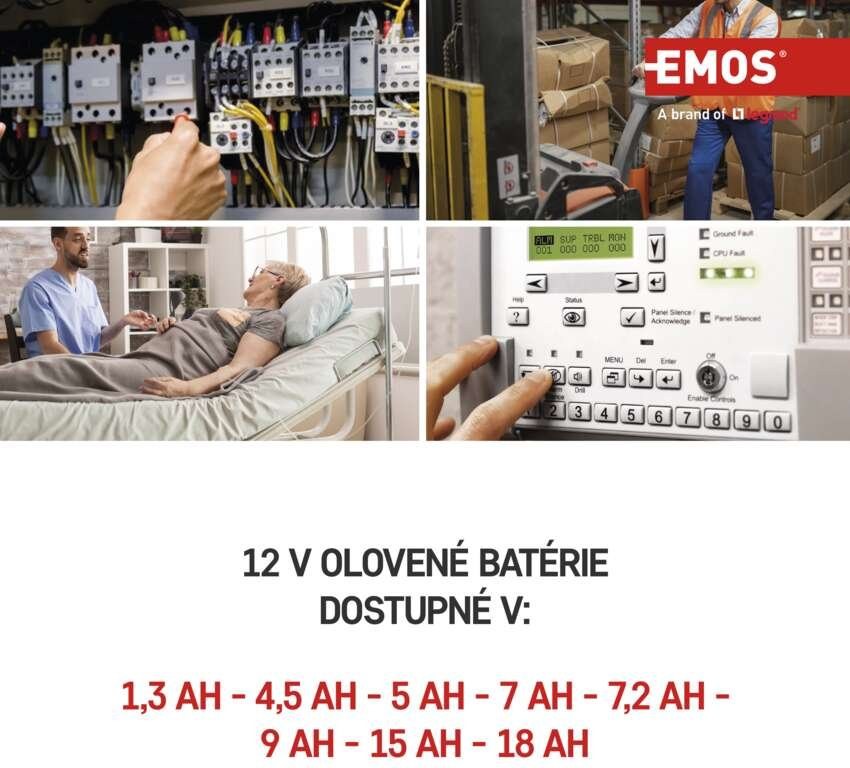 Olovené bezúdržbové batérie EMOS sú určené ako náhradné batérie pre záložné zdroje UPS, súpravy RBC, elektronické zabezpečovacie systémy (EZS), systémy elektrickej požiarnej signalizácie (EPS), záložné systémy výťahov atď.