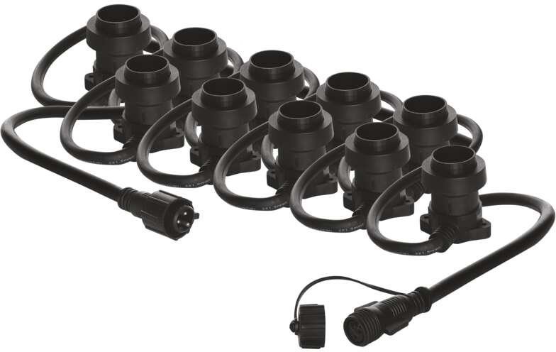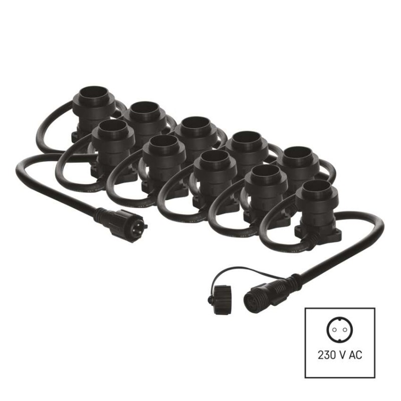 Spájacia svetelná reťaz je vybavená E27 objímkami, do ktorých môžete umiestniť žiarovky ľubovoľnej farby, tvaru a výkonu až do maximálneho výkonu 750 W. Jednoduchou výmenou žiaroviek môžete doladiť útulnú atmosféru na balkóne, terase, vonkajších oslavách, svadbách, kultúrnych podujatiach atď. Pripojenie spojovacej svetelnej reťaze k napájaciemu káblu (nie je súčasťou balenia) alebo k iným svetelným reťaziam je vďaka vodotesným skrutkovým konektorom hračkou. Reťaz zvládne aj nepriaznivé počasie - objímka žiarovky je vybavená gumovým tesnením, ktoré prilieha k nainštalovanej žiarovke po celom jej obvode a zabraňuje prenikaniu vody.
