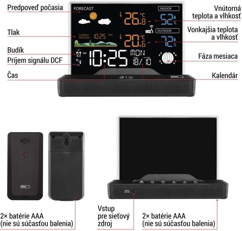 meteostanica, LED VA podsvietenie displeja lepší kontrast a najtmavšia čierna farba, napájanie stanice: permanentne adaptérom alebo 2× batériami AAA, napájanie snímača: 2 × 1,5 V AAAZobraziť viac