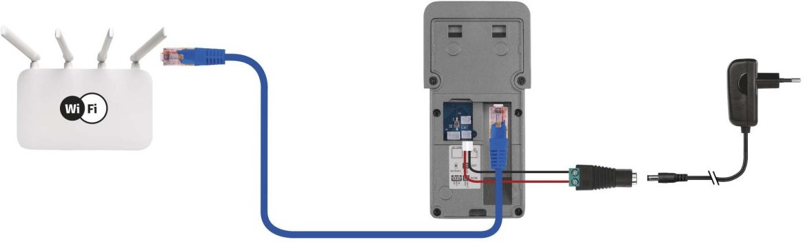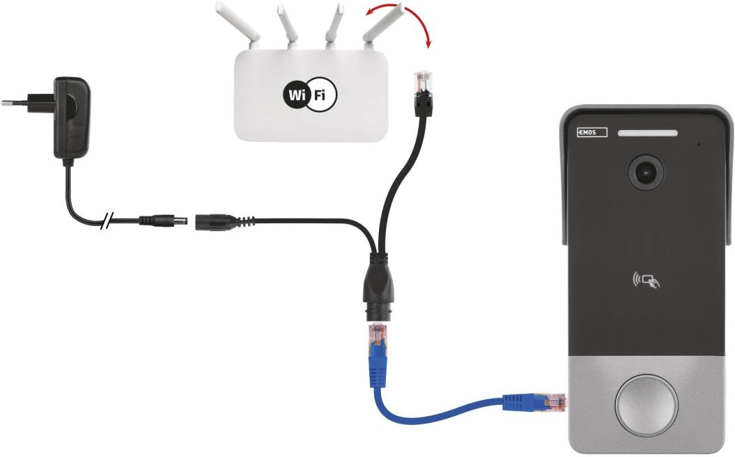 Hlavnou výhodou tohto moderného videozvončeka je napájanie cez Ethernet (PoE). Táto technológia umožňuje prenos napájania spolu s údajmi prostredníctvom jediného ethernetového kábla. Jediný kábel môže poskytovať dátové pripojenie aj napájanie pre rôzne zariadenia, ako sú IP kamery, bezdrôtové prístupové body (WAP) alebo telefóny VoIP. Injektor kábla PoE je súčasťou balenia.