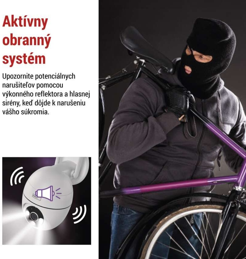 Kvalitný LED reflektor zabezpečuje osvetlenie monitorovaného priestoru a farebný záznam aj v úplnej tme, navyše spolu s integrovanou sirénou vytvára aktívny obranný systém.