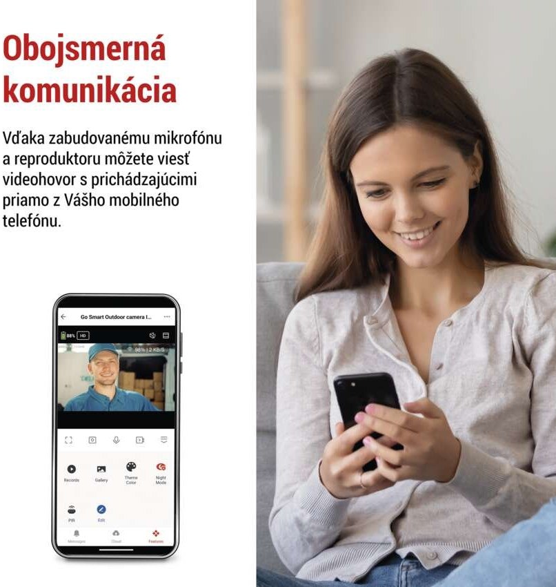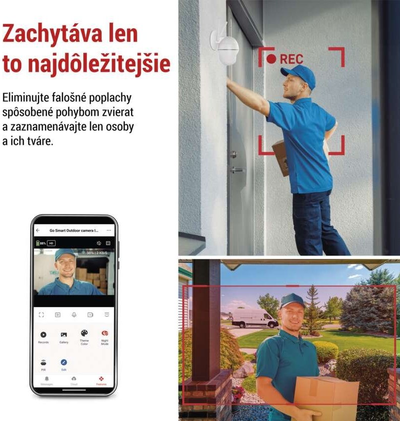 Inteligentná funkcia kamery dokáže eliminovať falošné poplachy spôsobené pohybom zvierat alebo vozidiel. Zaznamenávajú sa len osoby a ich tváre. Na základe detekcie pohybu a zvuku dostanete upozornenie na mobilný telefón a zároveň kamera začne robiť záznam snímok, ktoré automaticky uloží na cloudové úložisko alebo micro SD kartu s kapacitou až 128 GB.