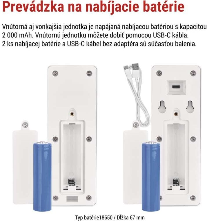 Vnútorná aj vonkajšia jednotka sú napájané 2 000 mAh akumulátorom (2 sú súčasťou balenia). K dispozícii je indikátor slabej batérie a praktický nabíjací kábel USB-C, ktorý je tiež súčasťou balenia. Inštalácia je maximálne jednoduchá - stačí ju zapojiť a začať používať.