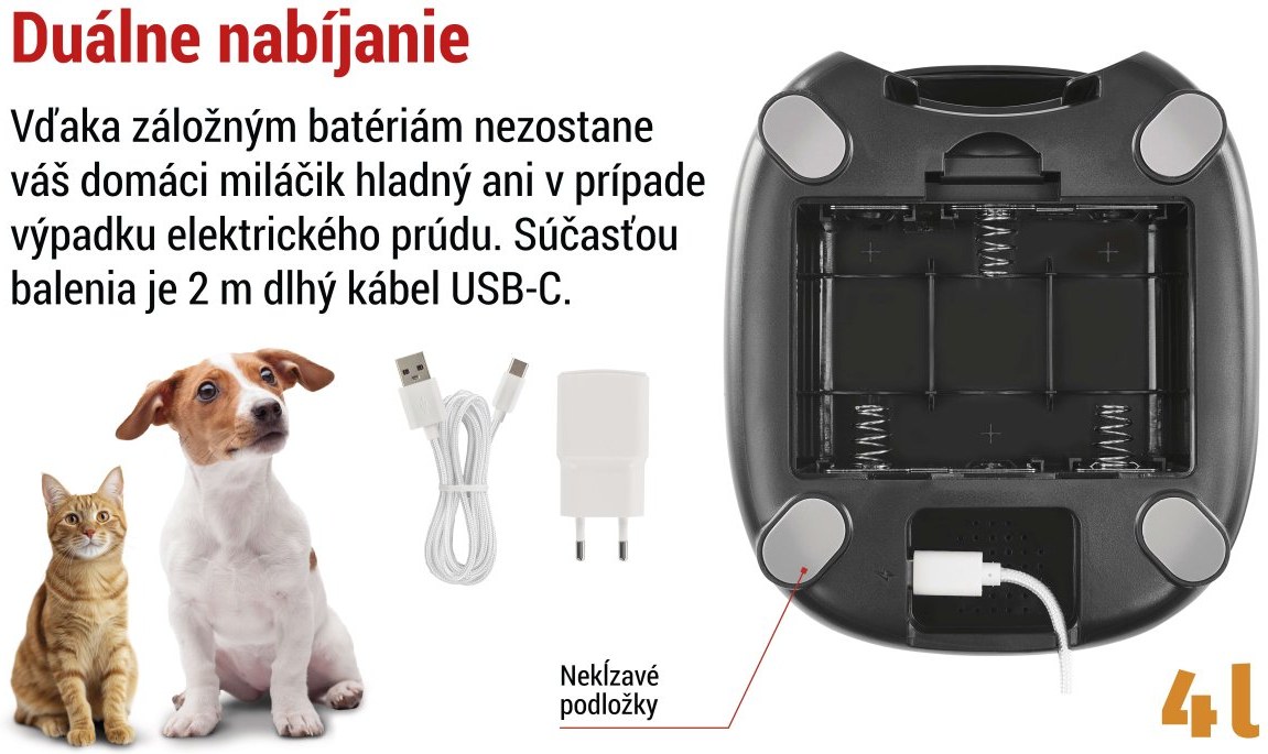 Napájanie zabezpečuje 2 m dlhý kábel USB-C s napájaním. Vďaka záložným batériám, ktoré nie sú súčasťou balenia, sa nemusíte obávať o kŕmenie svojho domáceho maznáčika ani v prípade výpadku elektrického prúdu. Okrem toho vás optický signál upozorní, keď je potrebné vymeniť batérie.