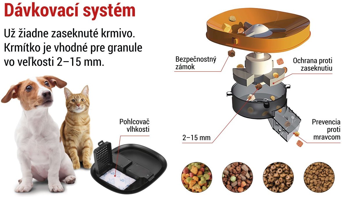 Vďaka funkcii proti rušeniu sa nemusíte obávať, že váš domáci miláčik nedostane svoju porciu. Krmítko je vhodné pre rôzne krmivá veľkosti 2 - 15 mm, má ochranu proti mravcom a vďaka bezpečnostnému zámku sa do dávkovača nedostanú ani nepozorné labky. Vďaka pohlcovaču vlhkosti je krmivo v dávkovači vždy čerstvé.